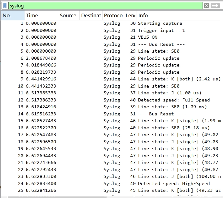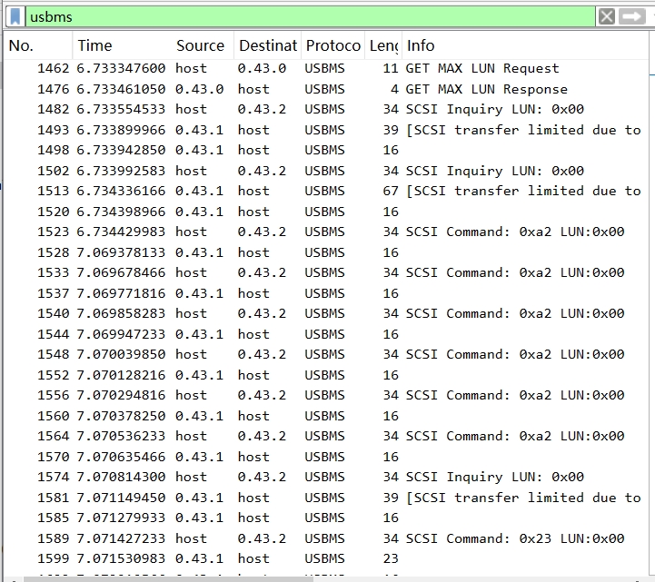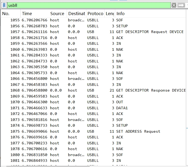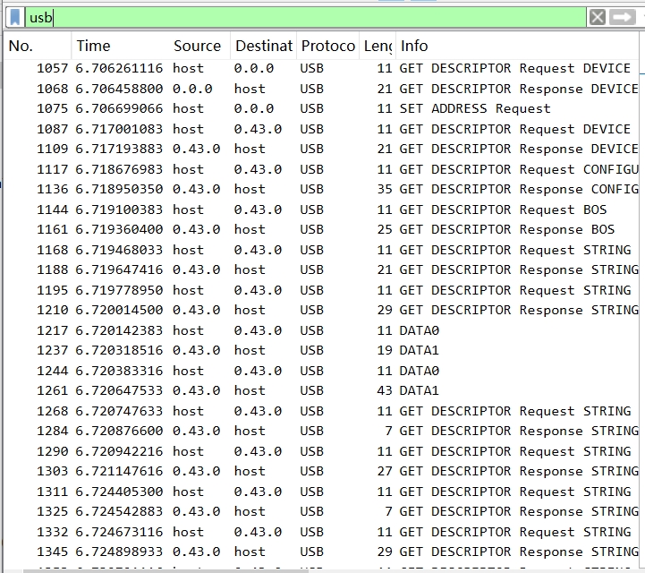 采集对象设备与A母。正常情况下,USB通讯立即开始,Wireshark中会显示捕获到的数据