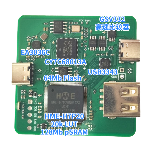 软硬件基于 ataradov.usb-sniffer 复刻,并继续以BSD-3-Clause license协议开源。核心变动是将其Lattice LCMXO2替换为京微齐力 H7P20,高速比较器替换为GSV332-MR。